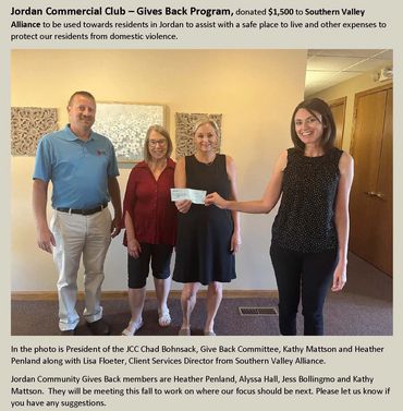 Jordan Commercial Club – Gives Back Program, donated $1,500 to Southern Valley Alliance to assist our neighbors find a safe place to live and support other expenses to protect our residents from domestic violence.